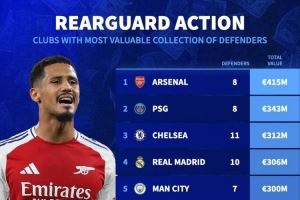 体育资讯9月24日讯 德国转会市场统计了各队阵容中后卫球员的总身价,并列出榜单,阿森纳4.15亿欧居首,巴黎、切尔西二三位。